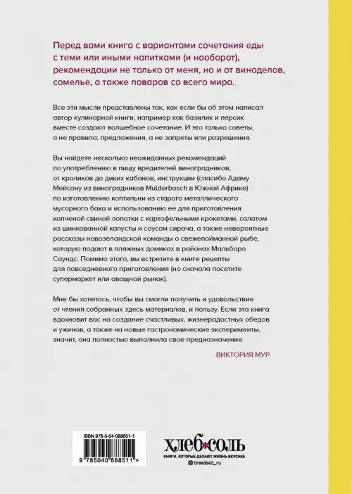 Перед вами книга с вариантами сочетания еды с теми или иными напитками и наоборот, рекомендации не только от автора, но и от виноделов, сомелье, а также поваров со всего мира. И это только советы, а не правила; предложения, а не запреты или разрешения. Тот, кто когда-либо чистил зубы и после этого сразу же выпивал стакан апельсинового сока, знает о влиянии вкуса еды на выпитый после нее напиток. Поэтому одна из целей данной книги — напомнить читателям, что этот принцип распространяется и на сочетание еды с вином, а также предложить инструменты и практические методы для предупреждения испорченности вина (или всего ужина). Если эта книга вдохновит вас на создание счастливых, жизнерадостных обедов и ужинов, а также на новые гастрономические эксперименты, значит, она полностью выполнила свое предназначение.