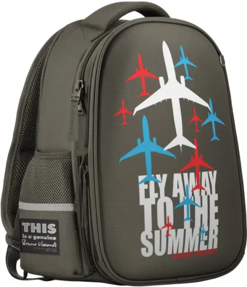 Рюкзак с авторским дизайном, с использованием сложнейших современных технологий нанесения на ткань. Ткань водонепроницаемая, морозостойкая, с повышенной износостойкостью, грязеотталкивающая. Модель имеет жесткий корпус. Двунаправленные-реверсивные надежные 8-мм молнии с 5-см пуллером на замках, что позволяет легко открывать и закрывать рюкзак. Эргономичная спинка, комфортная при длительном использовании, вентилируемая, с анатомическими подушечками. Регулируемые лямки анатомической формы и ручка с усиленным креплением готовы к любым нагрузкам. Износостойкая фирменная подкладка Bruno Visconti, тщательно подобранная и сочетающаяся с дизайном и цветом рюкзака. Рюкзак имеет два основных отделения: первое отделение содержит органайзер с молнией и карман-сеточку, второе отделение состоит из трех частей с двумя разделителями с фиксирующим ремнем и дополнено карманом на молнии для карточки. Рюкзак снабжён четырьмя светоотражающими элементами. Усиленное дно рюкзака оснащено резиновыми ножками, защищающими от загрязнения и влаги.