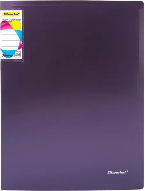 Папка с 40 файлами-вкладышами цвета сиреневый металлик. Изготовлена из двухслойного пластика, внешний, сиреневый, с металлическим отливом и внутренний, черный, слой. Прозрачный карман на внутренней стороне лицевой обложки, бумажный вкладыш на корешке папки. Толщина пластика 0,8 мм, первичное сырье, что обеспечивает долгое использование папки без потери внешнего вида.