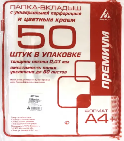 Папка-вкладыш Бюрократ "Премиум", красный край, глянцевые, А4+, 50 штук, арт. -013BKAN2RED
