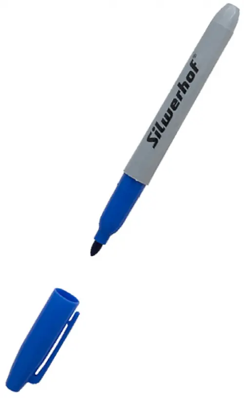 Практичная модель перманентного маркера синий цвета. Пулевидный наконечник с толщиной письма 2,5 мм.