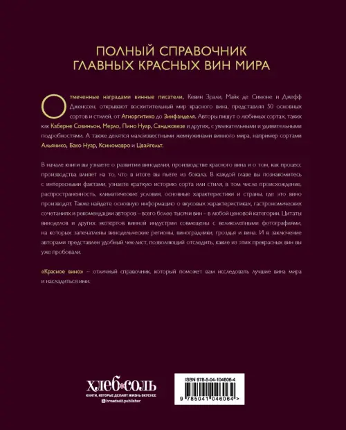 "Красное вино" — полный справочник главных красных вин мира, который поможет вам исследовать лучшие вина и насладиться ими. Из книги вы узнаете о развитии виноделия, производстве красного вина и как процесс производства влияет на то, что в итоге вы пьете из бокала. Вы познакомитесь с интересными фактами и насладитесь прекрасными фотографиями, а еще узнаете новое о сортах и стилях. В книге собрана основная информация о вкусовых характеристиках, гастрономических сочетаниях и рекомендациях авторов — всего более тысячи вин — в любой ценовой категории. И в заключение вы найдете удобный чек-лист, позволяющий отследить, какие из этих прекрасных вин вы уже пробовали.