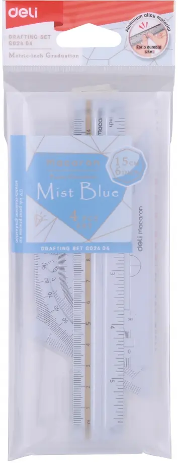 Довольно приличного китайского качества набор линеек Deli Macaron. Станет надежным спутником на уроках по таким предметам, как геометрия и черчение. Пригодится также при выполнении творческих занятий. Предметы в наборе (линейка, транспортир, два уголка) выполнены из алюминия. Все выполнено тщательно, значения нанесены аккуратно. Однозначно стоит св...