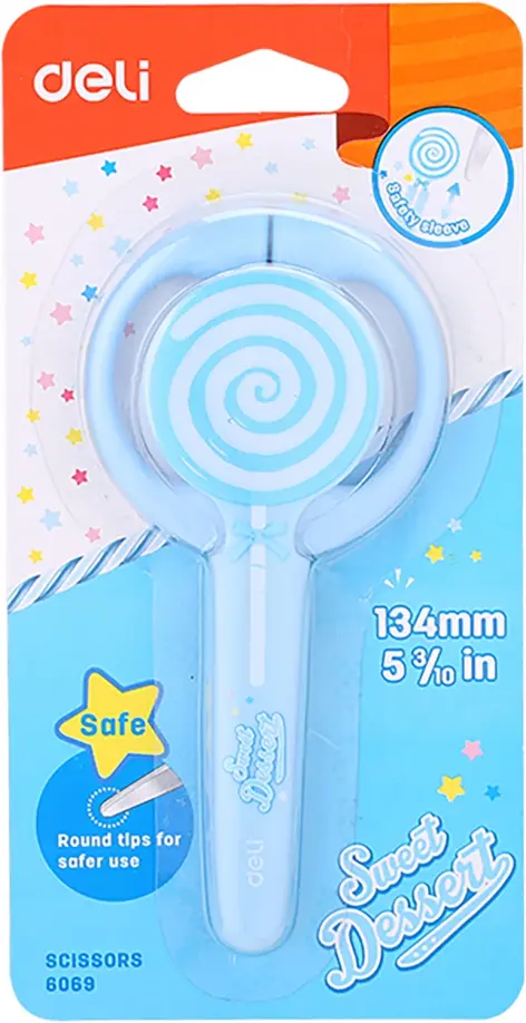 Ножницы Deli Lollipop детские. Длина ножниц 134 мм. Симметричные кольца ножниц не создают дискомфорта при длительном использовании, лезвия закруглены. Прочное режущее лезвие из нержавеющей стали. Тупой наконечник для безопасного использования. Защитный чехол. Отлично режут бумагу и картон. Ножницы будут радовать вашего ребенка ярим дизайном и не позволят потеряться на рабочем столе или в пенале.