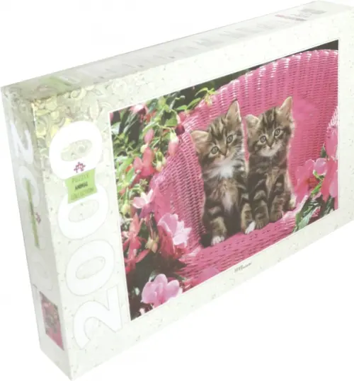 Пазл "Милые котята" состоит из 2000 элементов и входит в серию "Animal collection". С картинки на нас смотрят два пушистых малыша, которые сидят на плетёном розовом кресле.