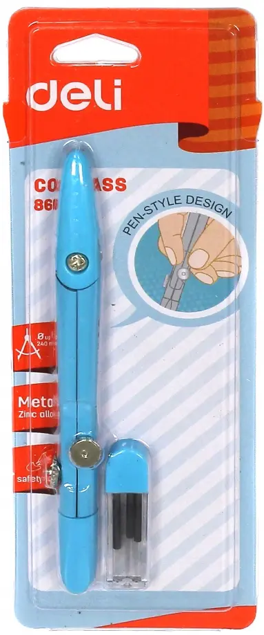 Циркуль металлический в комплекте с запасным грифелем. Специально сделанные ножки для повышения точности черчения.