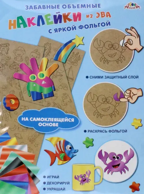 В наборе лист мягкого пластика EVA размером 18х23 см. Лист толщиной 2 мм имеет клевой слой с двух сторон. На листе высечены фигурки. Также в наборе разноцветные листы фольги размером 10х10 см и пластиковый стилус. Сними защитный слой с фигурки, приложи к клеевому слою цветную фольгу (цветной стороной вверх), прижми фольгу стилусом получится раскрашенная фольгой объемная наклейка.