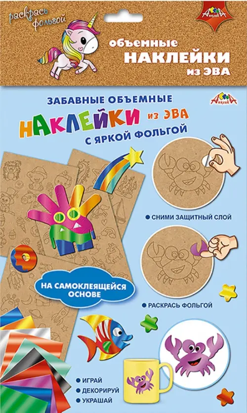 В наборе лист мягкого пластика EVA размером 18х23 см. Лист толщиной 2 мм имеет клевой слой с двух сторон. На листе высечены фигурки. Также в наборе разноцветные листы фольги размером 10х10 см и пластиковый стилус. Сними защитный слой с фигурки, приложи к клеевому слою цветную фольгу (цветной стороной вверх), прижми фольгу стилусом получится раскрашенная фольгой объемная наклейка.