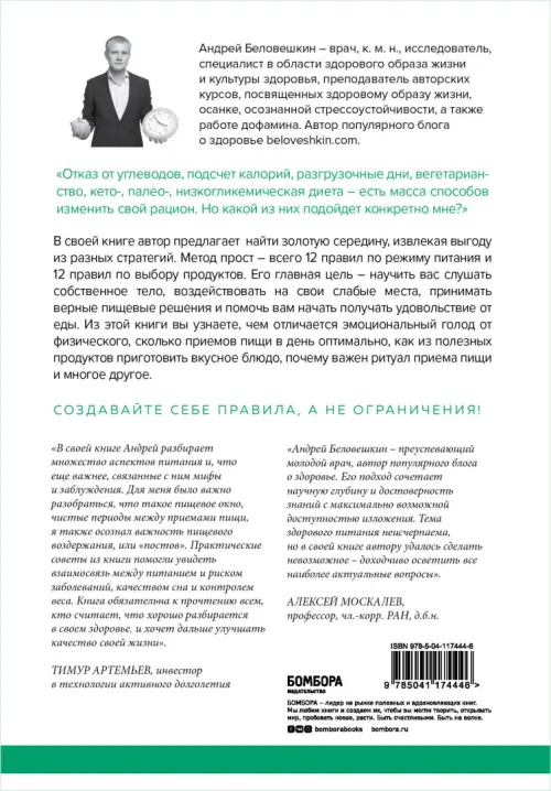 Книга Андрея Беловешкина, врача, к.м.н., преподавателя, — это свод гибких правил, каждое из которых можно применять отдельно. Правила режима питания, выбора продуктов, а также психологии питания дают ответы на самые важные вопросы — когда есть? что есть? и как есть? Кроме этого, в этом издании вы найдете меню на 6 дней, к каждому из которых сгенерирован QR-код, используя который вы сможете посмотреть видео-версию всех рецептов!