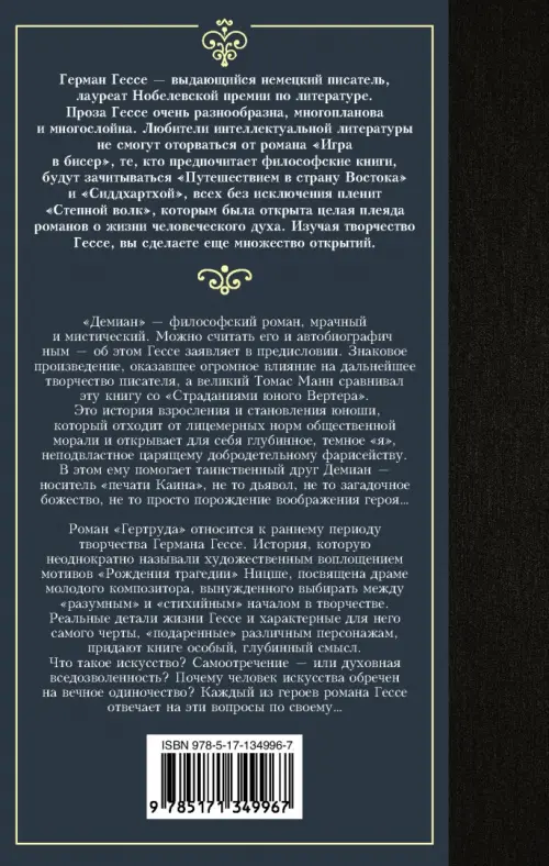 145 лет со дня рождения Германа ГессеЕсли вы обнаружили ошибку в описании товара «Демиан. Гертруда» (авторы: Гессе Герман), то выделите её мышкой и нажмите Ctrl+Enter. Спасибо, что помогаете нам стать лучше!
