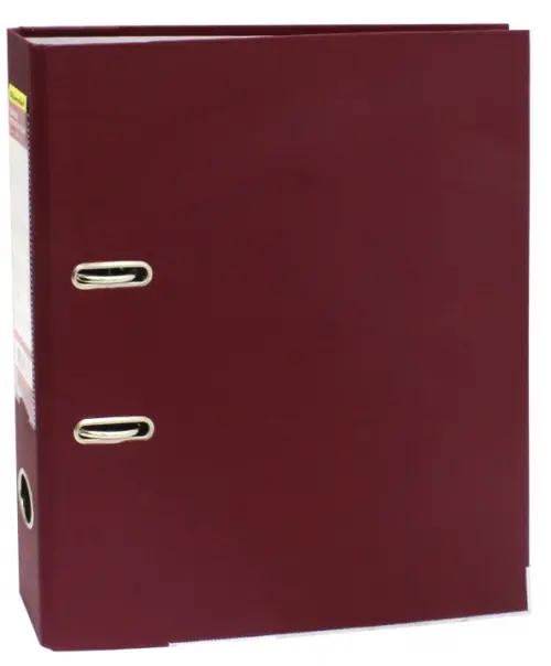 Папка-регистратор, снаружи обтянута прочным ПВХ, изнутри оклеена бумагой. На корешке прозрачный кармашек для сменной этикетки. Металлическая окантовка по нижнему краю. Ширина корешка 50 мм.