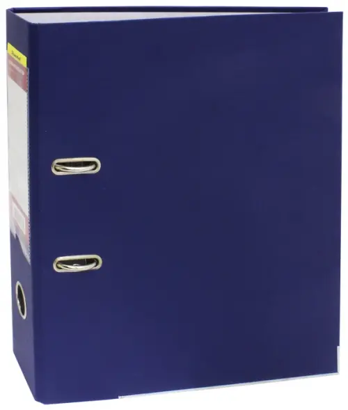 Папка-регистратор, снаружи обтянута прочным ПВХ, изнутри оклеена бумагой. На корешке прозрачный кармашек для сменной этикетки. Металлическая окантовка по нижнему краю. Ширина корешка 75 мм.