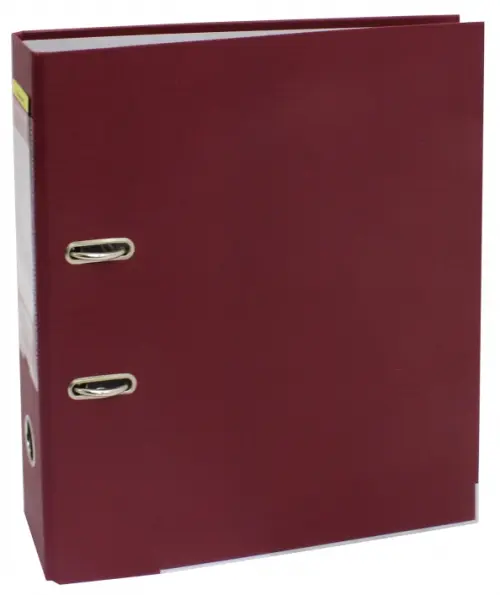 Папка-регистратор, снаружи обтянута прочным ПВХ, изнутри оклеена бумагой. На корешке прозрачный кармашек для сменной этикетки. Металлическая окантовка по нижнему краю. Ширина корешка 75 мм.