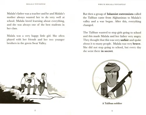 With carefully adapted text, new illustrations, language practise activities and additional online resources, the Penguin Readers series introduces language learners to bestselling authors and compelling content. Titles include popular classics, exciting contemporary fiction, and thought-provoking non-fiction. The Extraordinary Life of Malala Yousafzai, a Level 2 Reader, is A1+ in the CEFR framework. Sentences contain a maximum of two clauses, introducing the future tenses will and going to, present continuous for future meaning, and comparatives and superlatives. It is well supported by illustrations, which appear on most pages. Malala Yousafzai lived in Pakistan where she was one of the best students in her class. But then a group of Islamist extremists called the Taliban came and a war began. Then, one day, two men from the Taliban shot Malala on the bus home from school.