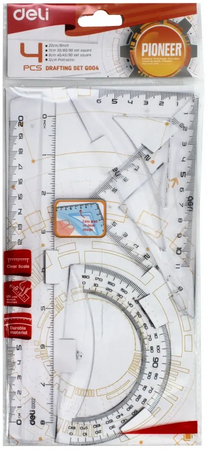 Набор пластиковых предметов для черчения, серии Pioneer с подъемным механизмом: у каждого предмета закругленные ребра, чтобы легко поднять с поверхности стола необходимо нажать на край предмета. В набор входит линейка, треугольники, транспортир.