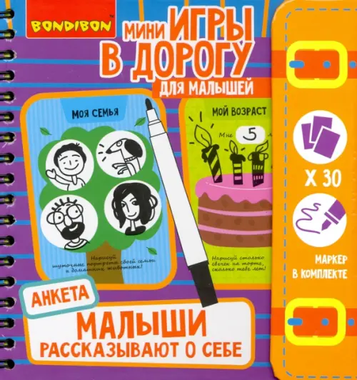 "Малыши рассказывают о себе" - это увлекательная книжка-анкета с различными забавными вопросами, ответы на которые в основном нужно рисовать! Многоразовые ламинированные страницы и легко стирающийся маркер позволят малышу фантазировать сколько угодно, а родители смогут фиксировать ответы в разные периоды его жизни, о чем в будущем будет интересно вспомнить вместе!