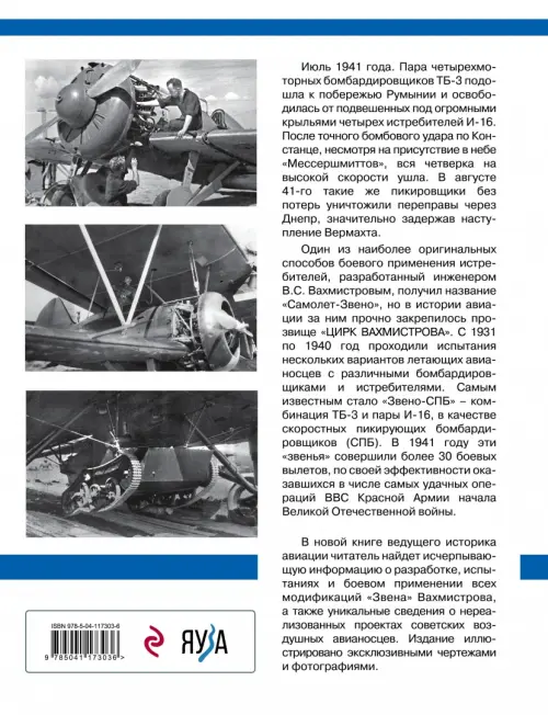 Июль 1941 года. Пара четырехмоторных бомбардировщиков ТБ-3 подошла к побережью Румынии и освободилась от подвешенных под огромными крыльями четырех истребителей И-16. После точного бомбового удара по Констанце, несмотря присутствие в небе "Мессершмиттов", вся четверка на высокой скорости ушла. В августе 41-го такие же пикировщики без потерь уничтожили переправы через Днепр, значительно задержав наступление Вермахта. Один из наиболее оригинальных способов боевого применения истребителей, разработанный инженером В.С. Вахмистровым, получил название "Самолет-Звено", но в истории авиации за ним прочно закрепилось прозвище "ЦИРК ВАХМИСТРОВА". С 1931 по 1940 г. проходили испытания несколько вариантов летающих авианосцев с различными бомбардировщиками и истребителями. Самым известным стало "Звено-СПБ" – комбинация ТБ-3 и пары И-16, в качестве скоростных пикирующих бомбардировщиков (СПБ). В 1941 г. эти "звенья" совершили более 30 боевых вылетов, по своей эффективности оказавшихся в числе самых удачных операций ВВС Красной Армии начала Великой Отечественной войны. В новой книге ведущего историка авиации читатель найдет исчерпывающую информацию о разработке, испытаниях и боевом применении всех модификаций "Звена" Вахмистрова, а также уникальные сведения о нереализованных проектах советских воздушных авианосцев. Издание иллюстрировано эксклюзивными чертежами и фотографиями.