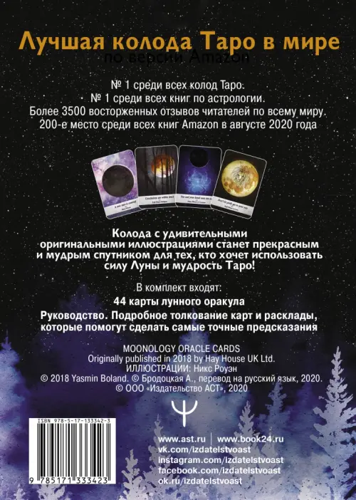 Каждая карта связана с положениями Луны на небосводе и энергиями, которые в этот момент влияют на нас, — рост или убывание, затишье или всплеск активности. Делая расклад, настраиваясь на карты, вы получаете совет, какие действия предпринять именно вам или над чем задуматься. Эта колода с удивительными оригинальными иллюстрациями станет прекрасным и мудрым спутником для тех, кто хочет использовать силу Луны!