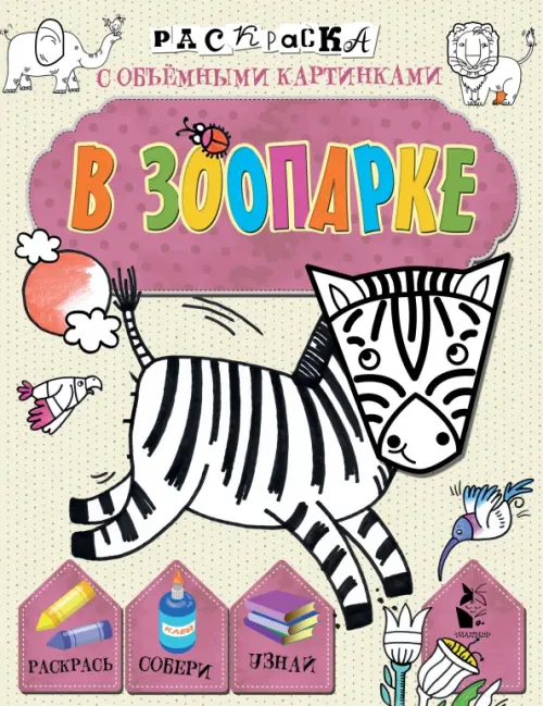 Эта раскраска необычная: в ней есть не только картинки с красочным фоном, но и дополнительные элементы на отдельных листах, которые тоже нужно раскрасить, выдавить и наклеить по схеме на основную картинку. Теперь так легко сделать собственными руками объемные модели животных, а заодно дать волю фантазии, развить творческие способности и сообразительность!