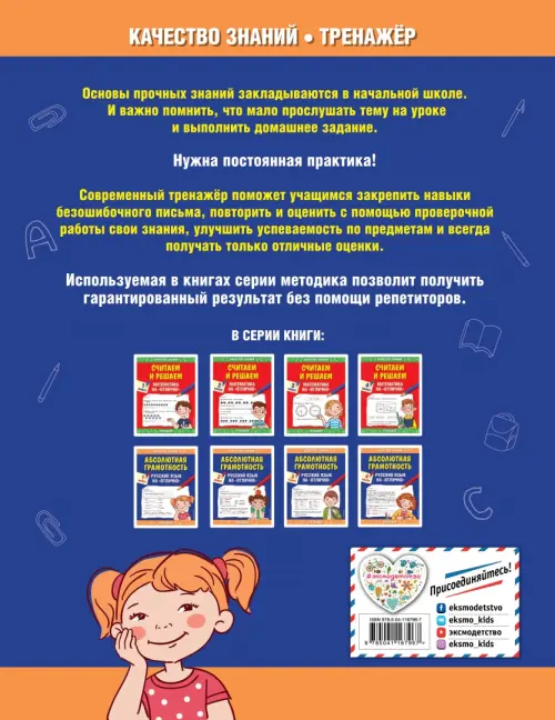 Для того чтобы ученик научился грамотно писать, нужно не только хорошо знать правила русского языка, но и много тренироваться. Тренажер, соответствующий ФГОС, содержит практический материал по основным темам русского языка для закрепления, повторения и проверки знаний. Многообразие заданий на правописание "жи — ши", "ча — ща", "чу — щу", "чк — чн", "ь" в словах, парных согласных на конце слов и т.д. позволит учащимся к завершению 1-го класса структурировать свои знания, в дальнейшем избежать ошибок при письме и довести навык грамотного письма до автоматизма, а проверочные работы в конце книги покажут, насколько качественно усвоен материал. Пособие можно использовать на уроках русского языка, при дополнительных занятиях дома, для повторения пройденных тем на каникулах и в начале следующего учебного года, а также для подготовки к контрольным и самостоятельным работам и ВПР. Книга окажет неоценимую помощь родителям и педагогам в формировании и закреплении навыков безошибочного письма и развитии орфографической зоркости у первоклассников.
