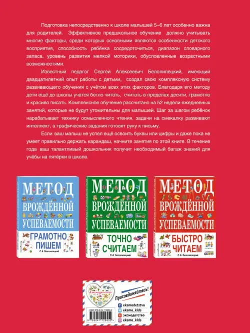За год шаг за шагом вместе с "Главной книгой дошкольника" ваш ребёнок без усилий и с большим интересом пройдёт подготовительный курс "дошкольной академии" по методике, которую предлагает известный педагог Сергей Белолипецкий. Все задания, которые предстоит выполнить будущему школьнику, полезны, действенны, просты, понятны и вызывают интерес. Постройте чёткий график занятий по этой книге, и через 52 недели до начала учебного года ваш ребёнок будет обладать знаниями и навыками по чтению, счёту и письму, которые останутся с ним надолго. Он будет полностью подготовлен к учёбе.