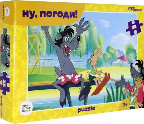 Пазл "Ну, погоди!" состоит из 35 элементов. Картинка пазла показывает нам теплый летний день — Заяц тут готовится кататься на водных лыжах.