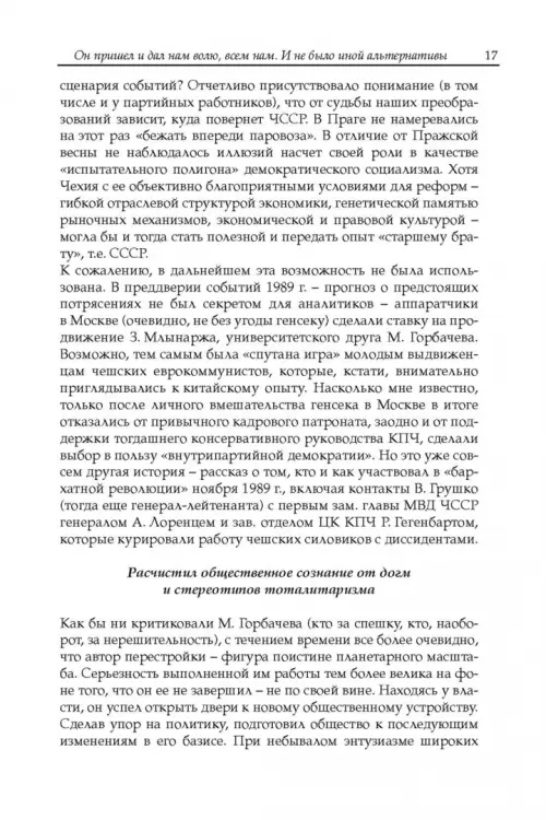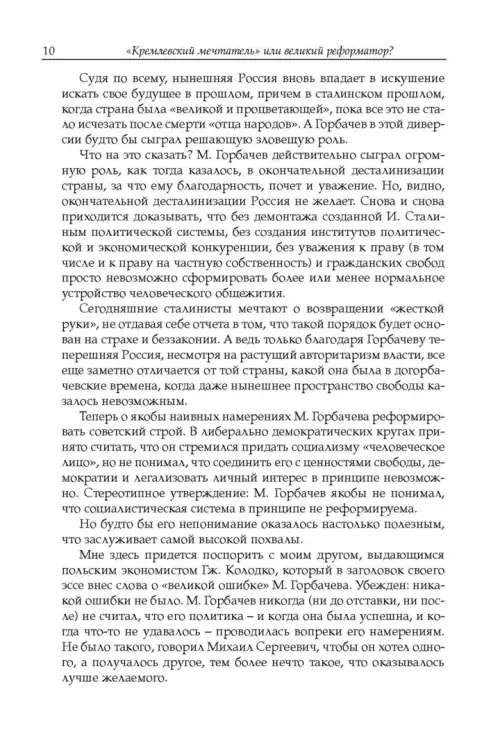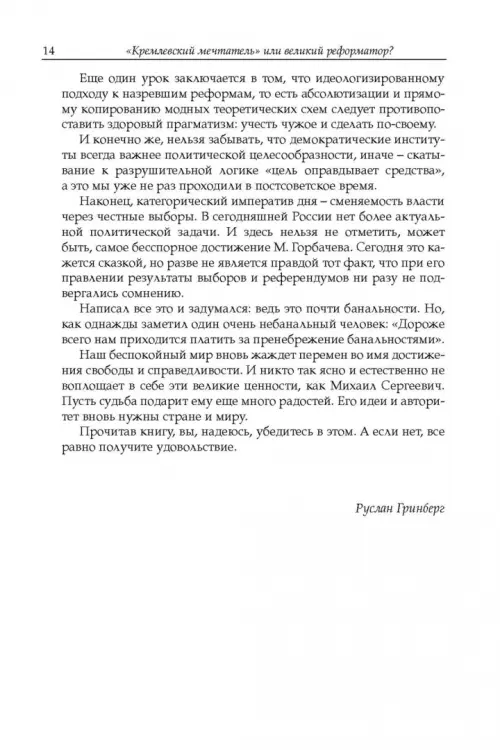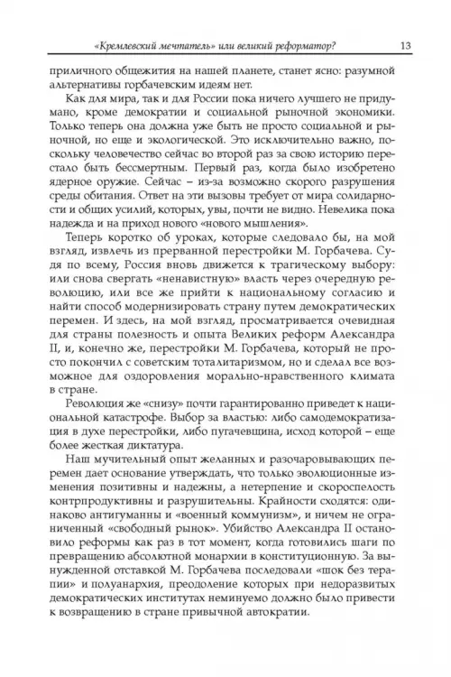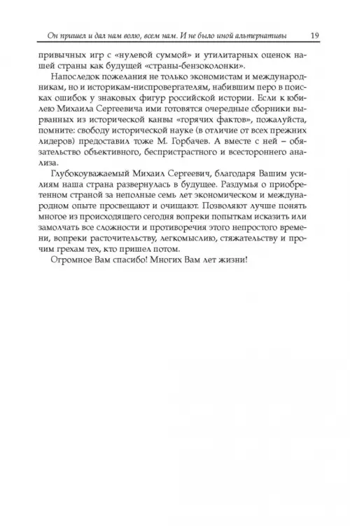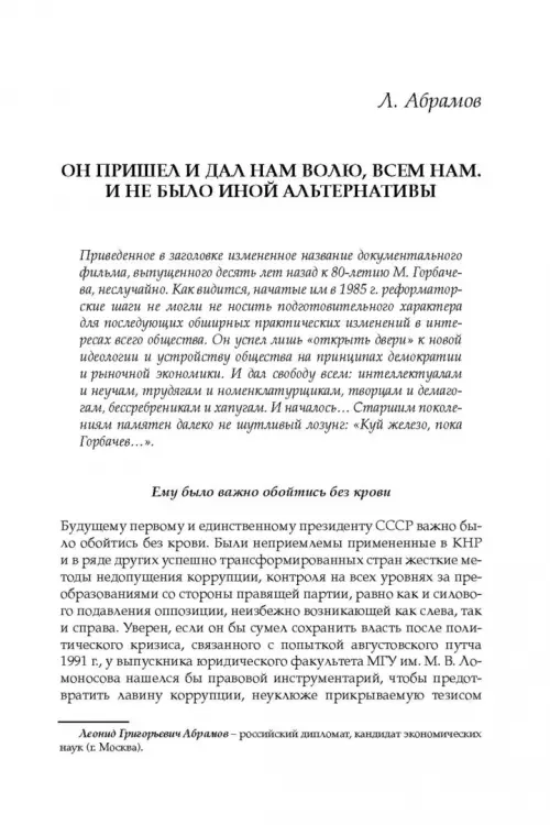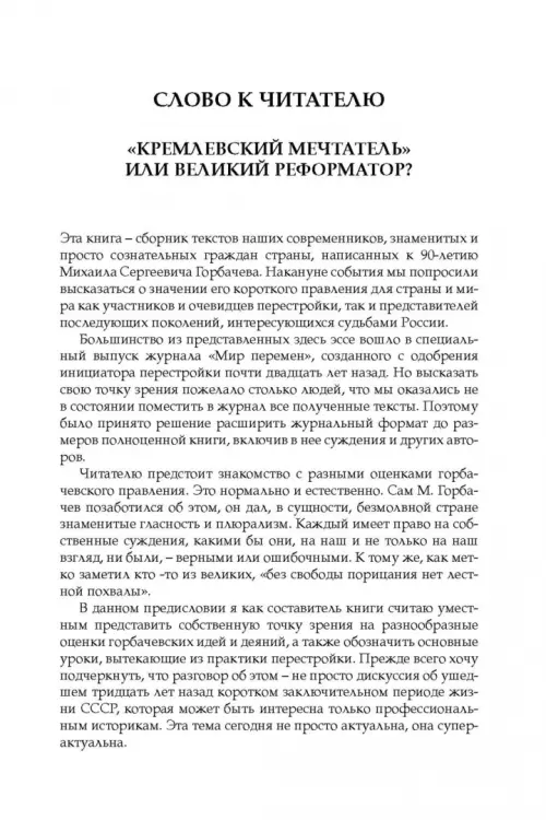 Сборник включает в себя тексты, написанные к 90-летию Михаила Сергеевича Горбачева. О значении его короткого правления для страны и мира высказались участники и очевидцы перестройки, представители последующих поколений. Читатели найдут в этой книге как одобрительные отзывы о политике первого и последнего президента СССР, так и критику его действий во время перестройки. В целом, перед вами мозаика суждений и оценок, которая представляет нам многогранный портрет человека, радикально изменившего жизнь не только страны, но и всего мира.