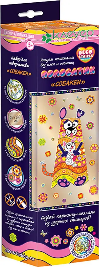 Набор "Полосатик Собакен" в популярной технике декорирование стикерами открывает новые грани "творчества без границ" для детей старше 5 лет - создание изображения из орнаментальных волнистых полосок-стикеров (aнгл. «stripes» - полосы). Ребёнок старше 5 лет без клея и ножниц наклеит на "кофейный" пластик-фон по шаблону разноцветные полоски с рисунками, подбирая их по цвету, оторвёт концы полосок с двух сторон для получения силуэта, сверху наклеит детали-стикеры, идентифицирующие озорного пёсика, а в лапки - его постоянного "друга" - котика. Голографические стикеры и стикеры-цветы оживят картину. Подбирая полоски по цвету, ребёнок создаст своего уникального персонажа. Ребёнок может собрать всю коллекцию прикольных животных и украсить детскую комнату!