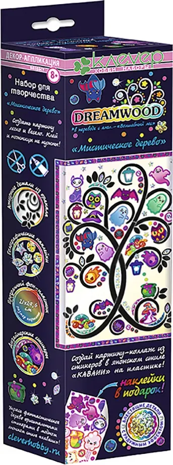 «Мистическое дерево» - набор для изготовления картины со стикерами-персонажами, нарисованными в стиле «kawaii». Работа с набором вовлечет детей старше 8 лет в творческий процесс по созданию неповторимого мира фантазии, где на волшебном дереве горят разноцветные фонарики, сидят страшные и одновременно милые персонажи мистического мира, у корней дерева прячутся грибы и горшочек с зельем для магических заклинаний, а вокруг "сверкают" звезды. Готовая картина станет украшением интерьера детской комнаты или подарком для друзей!