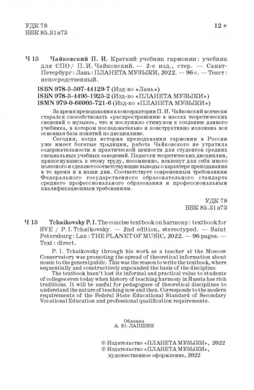 Если вы обнаружили ошибку в описании товара «Краткий учебник гармонии. Ученбник. СПО» (авторы: Чайковский Петр Ильич), то выделите её мышкой и нажмите Ctrl+Enter. Спасибо, что помогаете нам стать лучше!