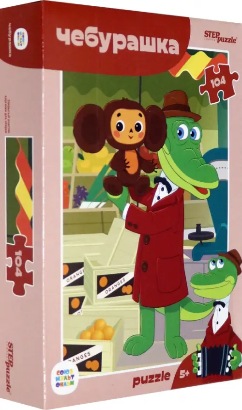 Пазл "Чебурашка" состоит из 104 элементов. На картинке представлен сюжет, как Гена нашел Чебурашку в ящиках с апельсинами.