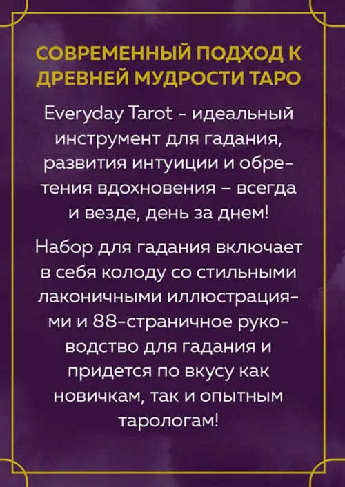 Everyday Tarot ("Таро на каждый день") — идеальный инструмент для гадания, развития интуиции и обретения вдохновения! Это миниатюрная колода со стильными лаконичными иллюстрациями художницы Элеоноры Грош и изящным золотистым обрезом. 88-страничное руководство для гадания таролога Бриджит Эссельмонт содержит всю основную информацию, необходимую, чтобы работать с колодой всегда и везде, день за днем! Колода также снабжена двумя дополнительными картами-памятками, описывающими процесс гадания и самые простые расклады. Благодаря своим компактным размерам и продуманной минималистичной подаче Everyday Tarot станет надежным и постоянным спутником как новичка, так и опытного таролога.