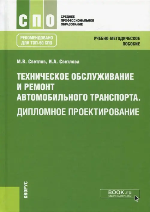 Рассматривается методология выполнения выпускных квалификационных работ (дипломных проектов) по специальности «Техническое обслуживание и ремонт автомобильного транспорта». Приведены необходимые для проектирования теоретические материалы, требования по оформлению, справочные и технические данные, примеры выполнения пояснительной записки и графической части проектов. Представлен перечень современного ремонтно-технологического оборудования, используемого при обслуживании и ремонте автомобилей. Соответствует ФГОС СПО последнего поколения. Для учащихся учреждений среднего профессионального образования.