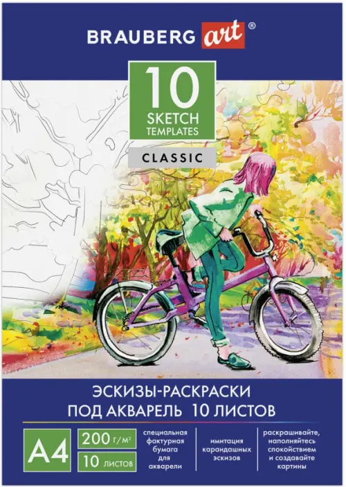 Папка для акварели с эскизами-раскрасками "Brauberg", А4, 10 листов, 200 г/м2