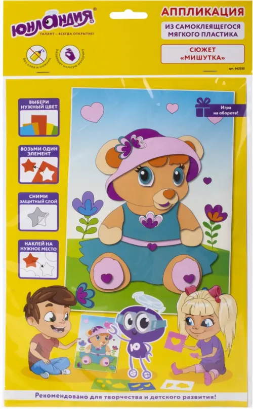 В набор входит яркая картонная основа размером 21х29 см с напечатанным дизайном аппликации, разработанным дизайнерами "Юнландия" специально для детей, а также 8 листов мягкого пластика разных цветов. Элементы аппликации перфорированы и имеют клеевой слой, что позволяет создать аппликацию без клея и ножниц.