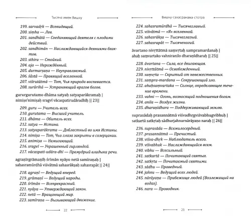 Гимны, описывающие имена Бога, — наиболее почитаемые сакральные тексты в индуизме. Они широко используется в созерцательных практиках и богослужениях. Эти имена в краткой форме передают знание о природе, атрибутах и разно образных проявлениях божественной реальности. В традициях мудрости имена Бога рассматриваются как могущественные мантры, помогающие избавиться от неведения и искажений в восприятии реальности, освободится от страданий и достичь целей человеческой жизни. Данное издание содержит санскритские тексты «Вишну-сахасранамы» и «Шива-сахасранамы» в транслитерации (IAST) и перевод каждого имени.