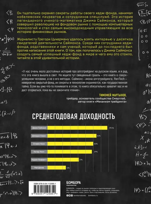 Журналисту Грегори Цукерману удалось взять интервью у десятков свидетелей деятельности Саймонса. Среди них сотрудники хедж-фонда, родственники и сам учёный, который до последнего был против написания этой книги. О том, как получилось у Джима Саймонса создать самый успешный хедж-фонд в мире и чего ему это стоило читайте в этой удивительной истории.
