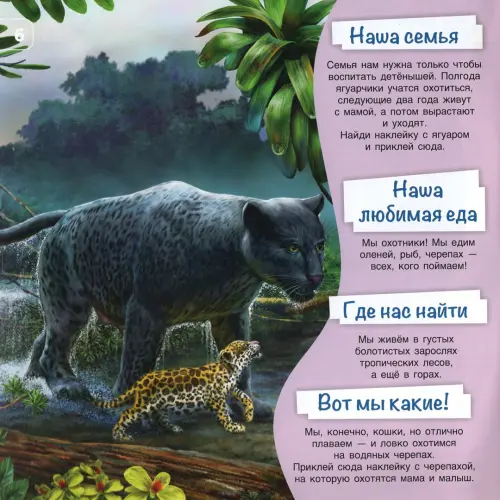 Энциклопедия для самых маленьких "Познакомимся поближе! Жители джунглей" с наклейками и викториной. Все животные на страницах этой книги! Прочитайте книгу, разверните клапаны и ответьте на вопросы викторины. Короткая и интересная информация о том, где живут разные животные, чем питаются и как ведут себя в детстве. После знакомства со всеми животными ребенок может ответить на вопросы викторины. Каждое животное расскажет о себе, а малышу нужно догадаться, кто это, и найти на листе наклеек его портрет. Ребенок узнает много нового и ему наверняка понравится приклеивать наклейки, чтобы заполнить страницы! Собрав всю серию наших энциклопедий с наклейками, малыш будешь знать всё о животном мире.