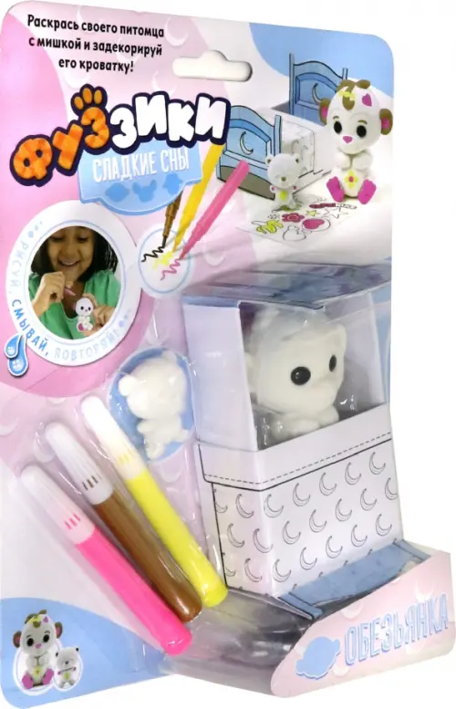 Фуззики - это милые питомцы, которых можно раскрашивать как тебе хочется! Фломастеры легко смываются водой, и ты можешь раскрашивать игрушки вновь и вновь, создавая каждый день новые образы для своего питомца. В наборе вы найдете обезьянку в кроватке, смывающиеся водой фломастеры и стикеры, чтобы украсить и персонализировать флокированного малыша и его кроватку.