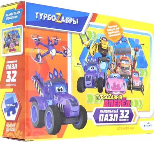 Герои мультфильма "Турбозавры" приглашают вместе попрактиковаться в умении собрать пазл, а заодно потренировать воображение, мелкую моторику, усидчивость и координацию движений. Очень крупные детали специально для самых маленьких! Готовый пазл можно использовать как напольный коврик. Функциональный размер позволит украсить интерьер.