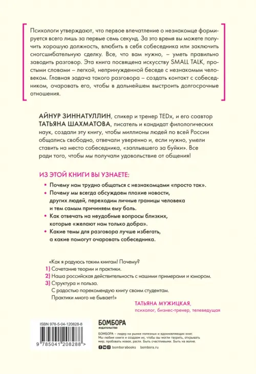 Психологи утверждают, что первое впечатление о незнакомце формируется всего лишь за первые семь секунд. За это время вы можете получить хорошую должность, влюбить в себя собеседника или заключить сногсшибательную сделку. Все, что вам нужно, – уметь правильно заводить разговор. Эта книга посвящена искусству SMALL TALK, простыми словами – легкой, непринужденной беседе с незнакомым человеком. Главная задача такого разговора – создать контакт с собеседником, очаровать его, чтобы в дальнейшем выстроить долгосрочные отношения. Айнур Зиннатуллин, спикер и тренер TEDx, и его соавтор Татьяна Шахматова, писатель и кандидат филологических наук, создали эту книгу, чтобы миллионы людей по всей России общались свободно, отвечали уверенно и, если нужно, умели ставить на место собеседника, "заплывшего за буйки". Все ради того, чтобы мы получали удовольствие от общения!