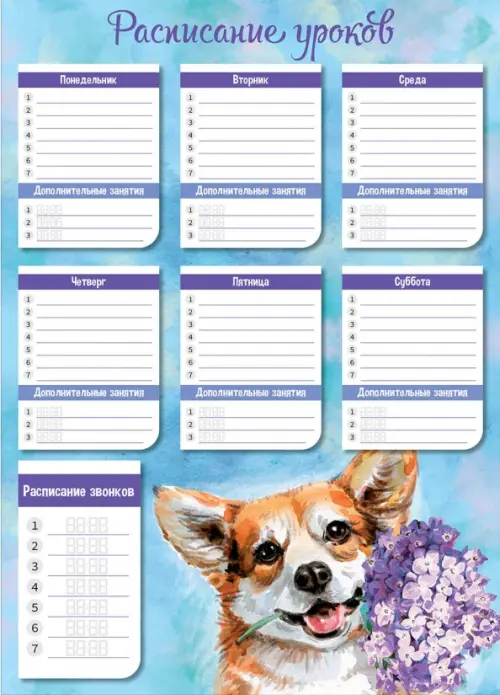 Расписание уроков выбирала дочь, самостоятельно. Её критерии выбора: расписание должно быть пастельных тонов, дни недели подписаны не прописным, а печатным почерком, рисунок - не совсем детский, а ненавязчиво приятный взору, понятное, не маленькое, среднего размера. Расписание уроков "Собачка с сиренью" полностью удовлетворило её запросы ...