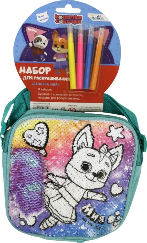 Яркий дизайн и необычная фактура пайеток, которые от одного движения рукой меняют цвет, оживляют привычный взгляд на детские сумки. А разноцветные маркеры позволят придать сумочке еще больше индивидуальности! Сумочка выполнена в дизайне "Кошечки-собачки", которая уже успела полюбиться многим детям.