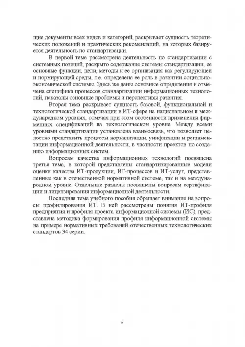 Учебное пособие посвящено разработке и стандартизации информационных технологий и прикладных информационных систем. В пособии приведена классификация информационных технологий (ИТ), рассматриваются характеристики и принципы стандартизации в сфере ИТ как на национальном, так и международном уровне, а также деятельность по сертификации и лицензировании информационных процессов, продуктов и услуг, представлены современные модели оценки их качества, применяемые в мировом сообществе. Подробно рассмотрены функциональные и технологические области стандартизации ИТ, изучены методологические основы проектирования информационных систем, установлены взаимосвязи между требованиями нормативных документов в соответствии со сферами их применения.