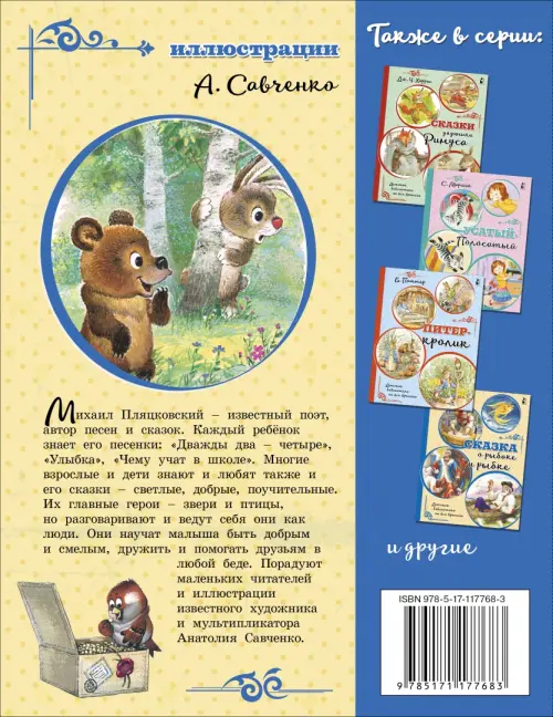 Михаил Пляцковский – известный поэт, автор песен и сказок. Каждый ребенок знает его песенки: «Дважды два – четыре», «Улыбка», «Чему учат в школе». Многие взрослые и дети знают и любят также и его сказки – светлые, добрые, поучительные. Хотя их главные герои – звери и птицы, но разговаривают и ведут себя они, как люди. Они научат малыша быть добрым и смелым, дружить и помогать друзьям в любой беде. Порадуют маленьких читателей и иллюстрации известного художника и мультипликатора Анатолия Савченко.