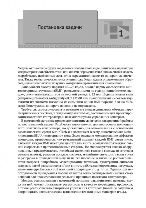 Книга предназначена для студентов технических специальностей, выпускников вузов или инженеров, желающих самостоятельно научиться математическому моделированию динамики в среде SimInTech на примере беспилотного летательного аппарата коптерного типа. Она может быть полезна также и тем, кто хочет самостоятельно разработать свою динамическую модель беспилотного летательного аппарата.