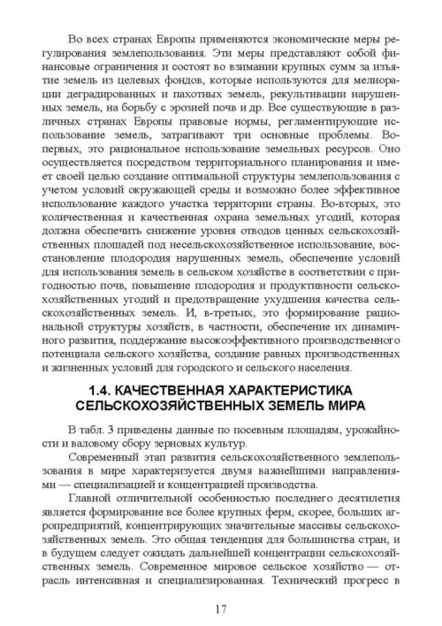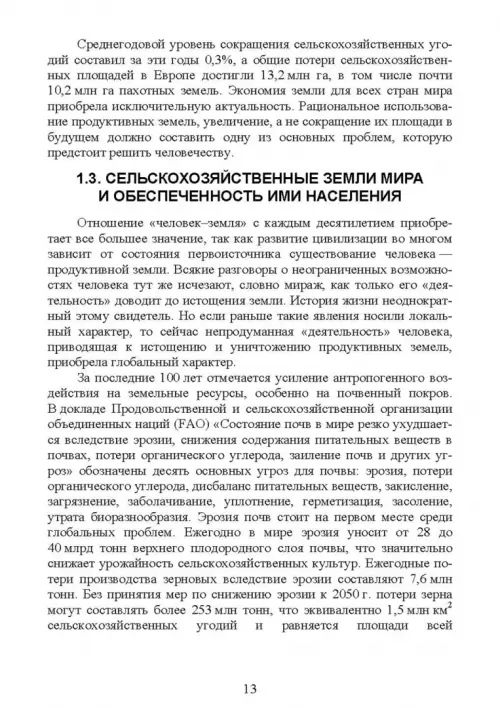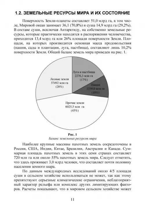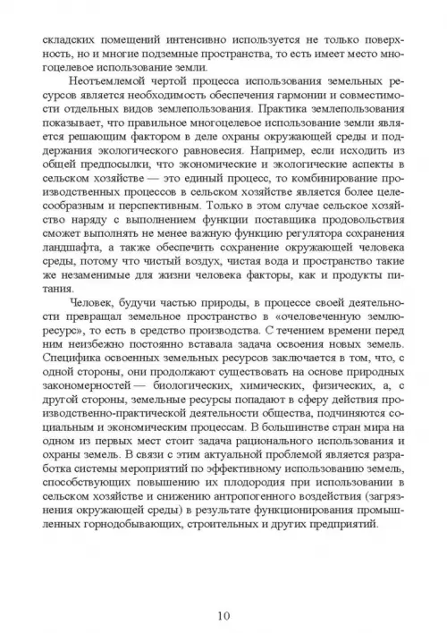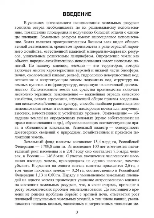 В учебном пособии приведены сведения о земельных ресурсах мира, Российской Федерации и их состоянии. Отмечено ухудшение плодородия земель в связи с их деградацией. Показано, что усиление антропогенного воздействия на земельные ресурсы увеличивает площади земель подверженных эрозии, закислению, дегумификации, засолению, потере основного компонента плодородия — гумуса. Кроме того, отмечается увеличение изъятия земельных площадей, в том числе и пашни для нужд промышленности, строительства, складирования отходов производства и быта, прокладки трубопроводов различного назначения и др. Одним из приёмов улучшения их состояния, повышения плодородия земель является использование различных видов мелиорации. Отмечена роль государственного кадастра в оценке земель и землеустройства, что играет значительную роль в повышении плодородия сельскохозяйственных земель и их охране. Предлагается ряд направлений в рациональном использовании земель, связанные с рекультивацией земли, воспроизводством их плодородия. Предлагается переходить к воспроизводству плодородия почв сельскохозяйственного назначения путём внедрения альтернативного земледелия. Указаны законодательные акты по охране земель и их рациональному использованию.