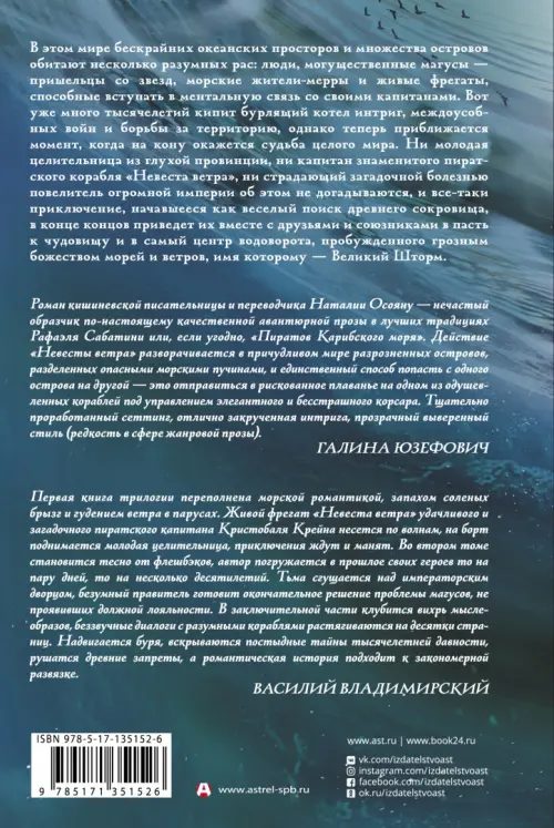 В этом мире бескрайних океанских просторов и множества островов обитают несколько разумных рас: люди, могущественные магусы — пришельцы со звезд, морские жители-мерры и живые фрегаты, способные вступать в ментальную связь со своими капитанами. Вот уже много тысячелетий кипит бурлящий котел интриг, междоусобных войн и борьбы за территорию, однако теперь приближается момент, когда на кону окажется судьба целого мира. Ни молодая целительница из глухой провинции, ни капитан знаменитого пиратского корабля «Невеста ветра», ни страдающий загадочной болезнью повелитель огромной империи об этом не догадываются, и все-таки приключение, начавшееся как веселый поиск древнего сокровища, в конце концов приведет их вместе с друзьями и союзниками в пасть к чудовищу и в самый центр водоворота, пробужденного грозным божеством морей и ветров, имя которому — Великий Шторм.