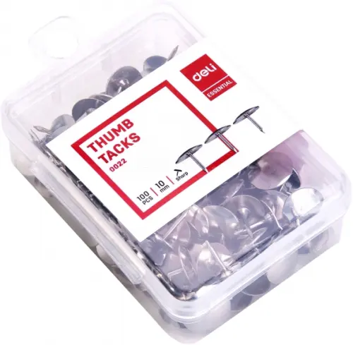 Кнопки Deli никелированные. Обеспечивают надежное крепление бумаги, фотографий, объявлений, заметок, документов и карт к различным поверхностям: стенам, деревянным и пробковым доскам.