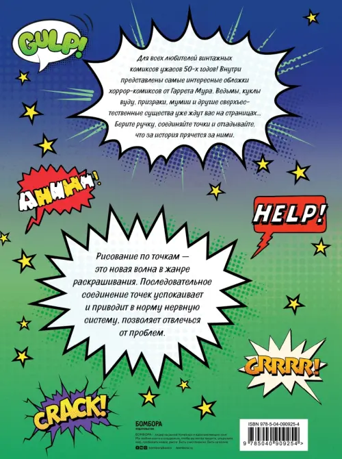 Для всех любителей винтажных комиксов ужасов 50-х годов! Здесь вы найдете 30 обложек легендарных американских хоррор-комиксов, леденящих душу! Ведьмы, куклы вуду, призраки, мумии и другие сверхъестественные существа уже ждут вас на страницах. Берите ручку, соединяйте точки и перед вами откроются фантастические изображения, которые помогут вам отвлечься после рабочего дня.